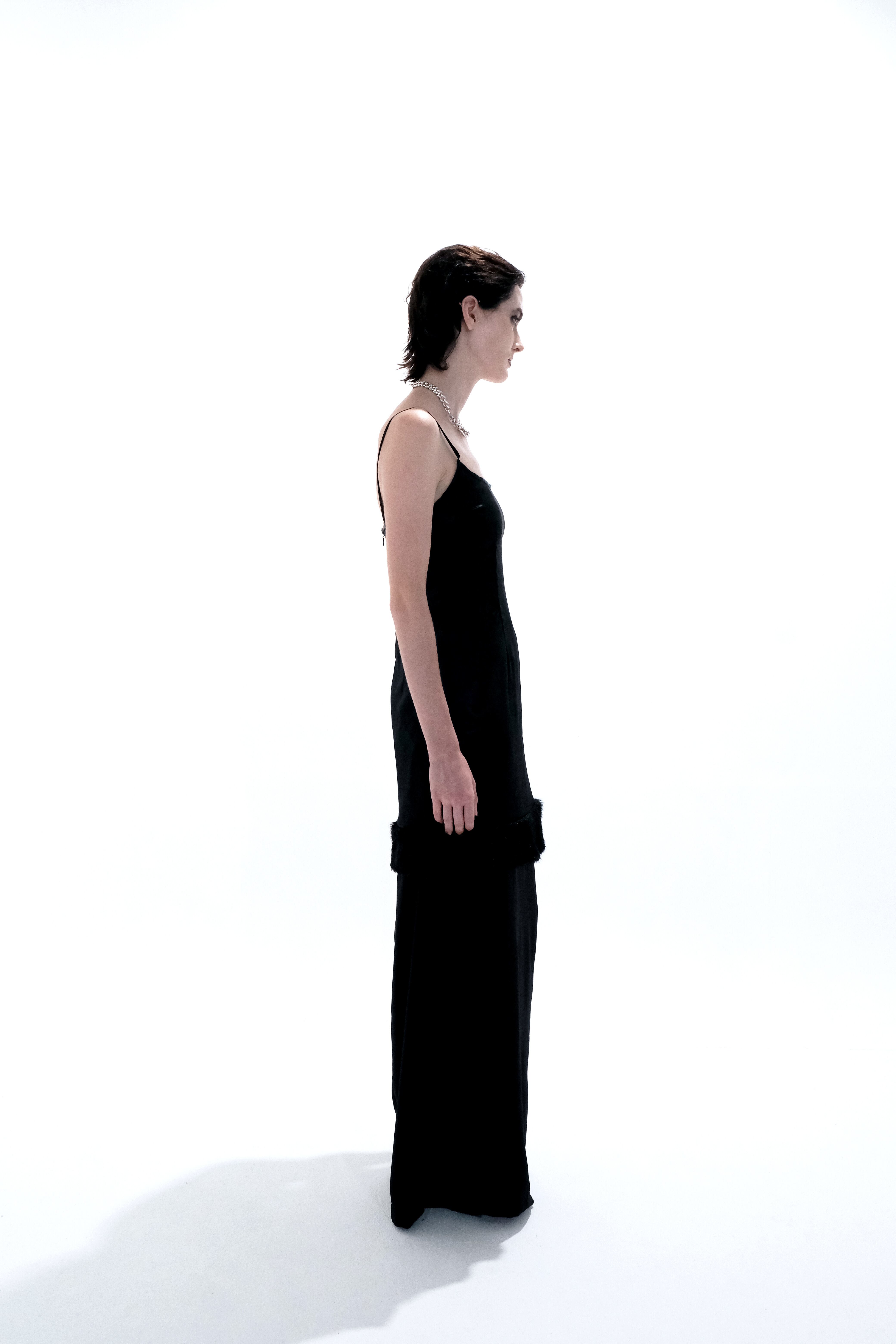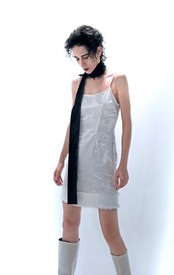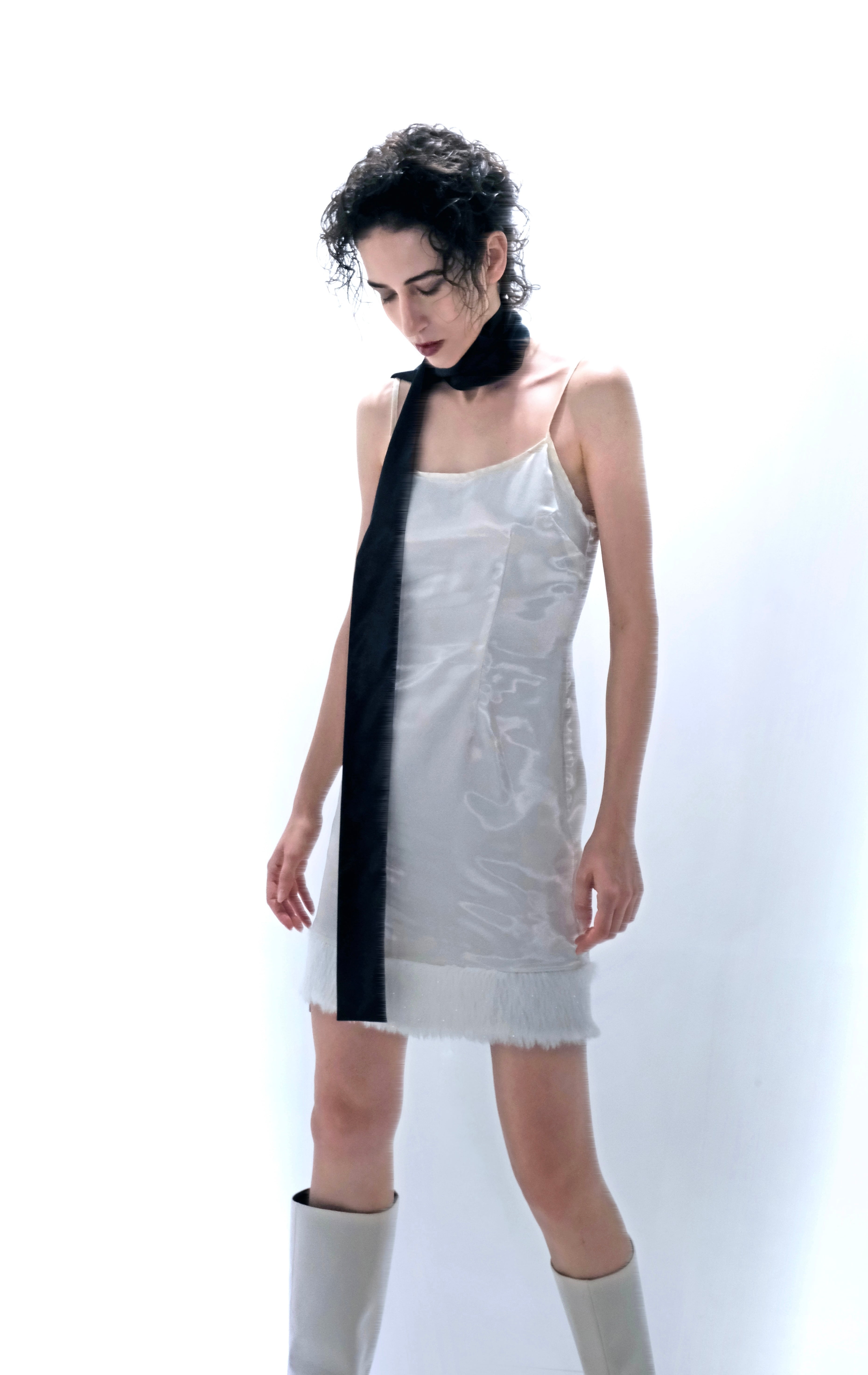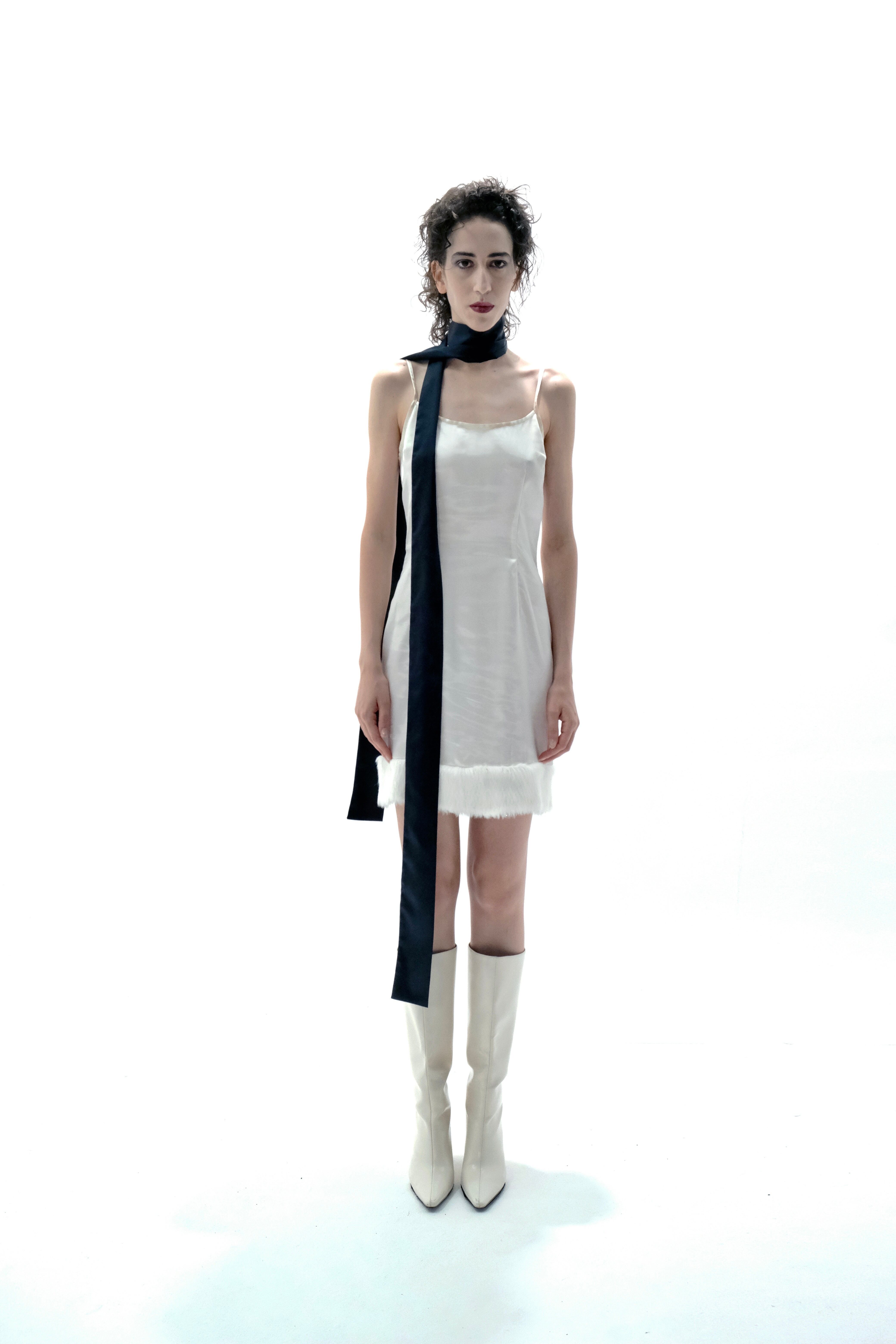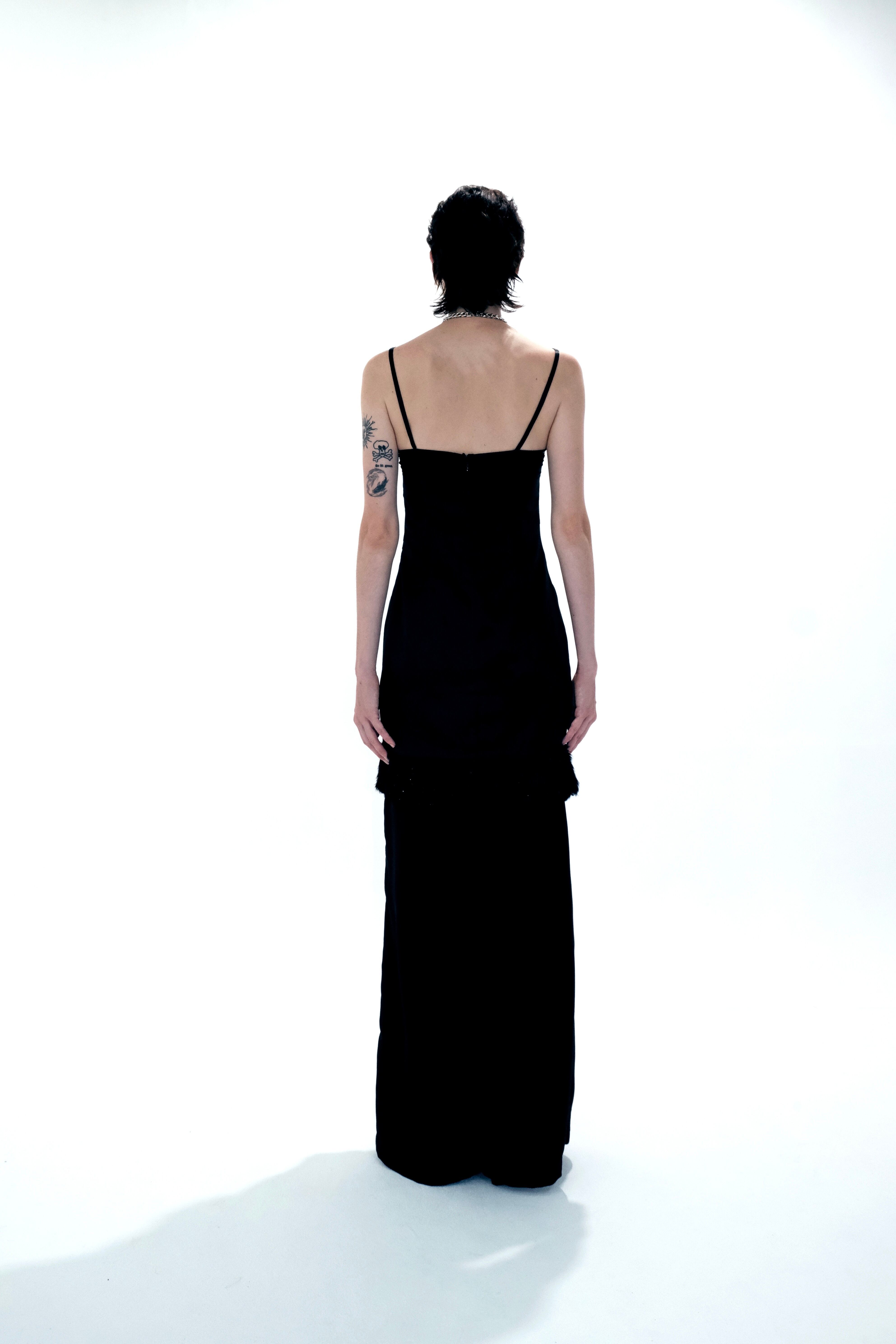 ラメ入りのファーをあしらったサテンキャミソールのワンピースです。